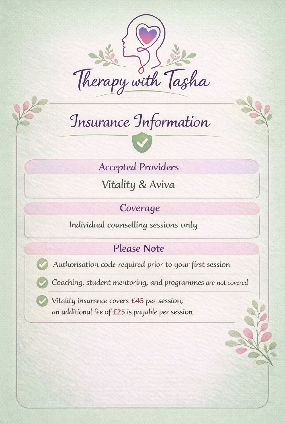 Vitality does not cover my full counselling fee, so there is an additional £25 per session payable by the client. Aviva sessions are covered at the approved rate with no additional charge.